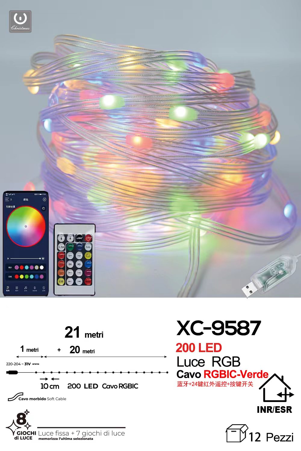 Catena luminosa 21 metri da 200LED RGB con controllo app o telecomando 8 giochi luce
