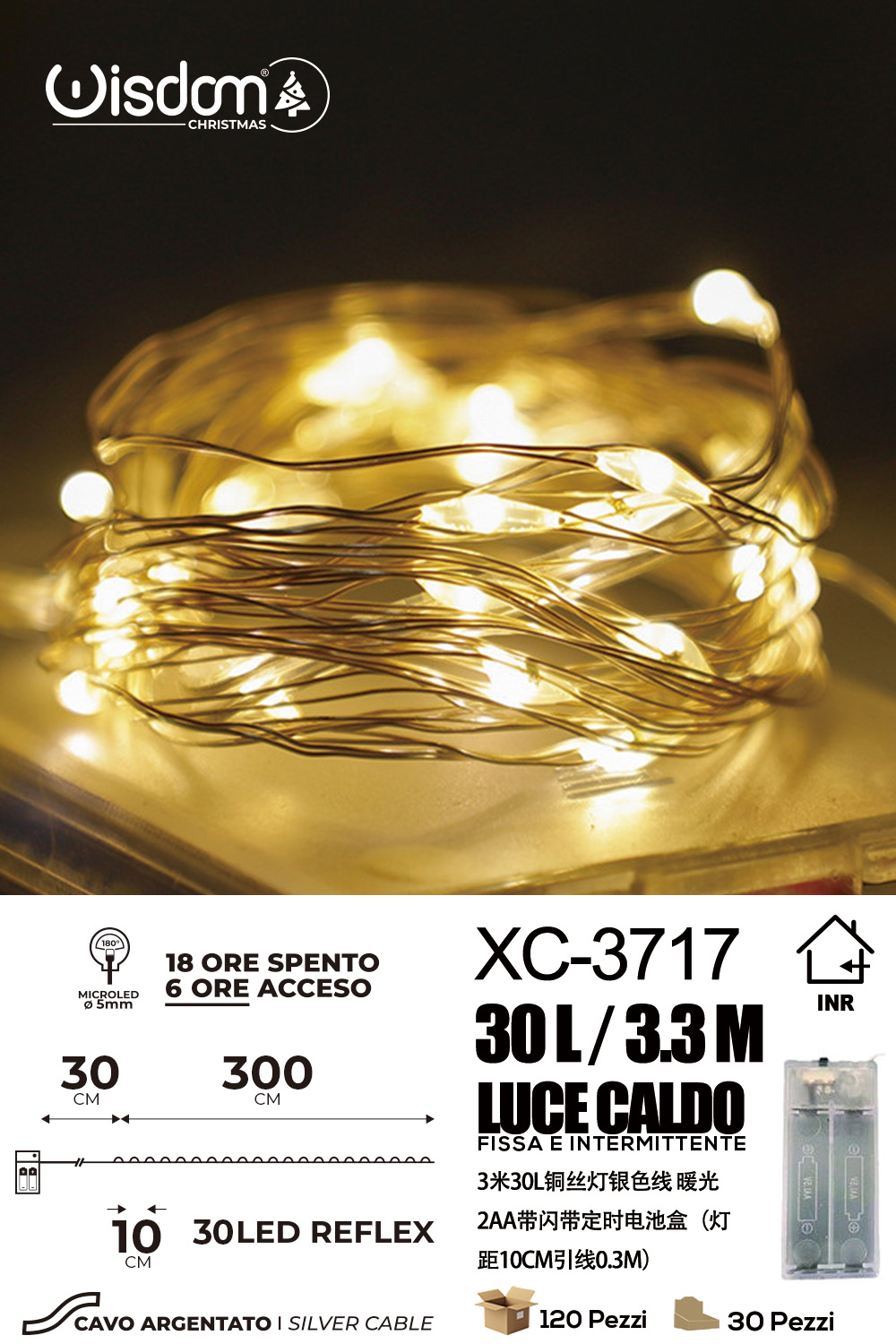 Catena luminosa 30 microLED REFLEX luce calda fissa e intermittente da 3,3 metri alimentazione a pile per uso interno con funzione timer