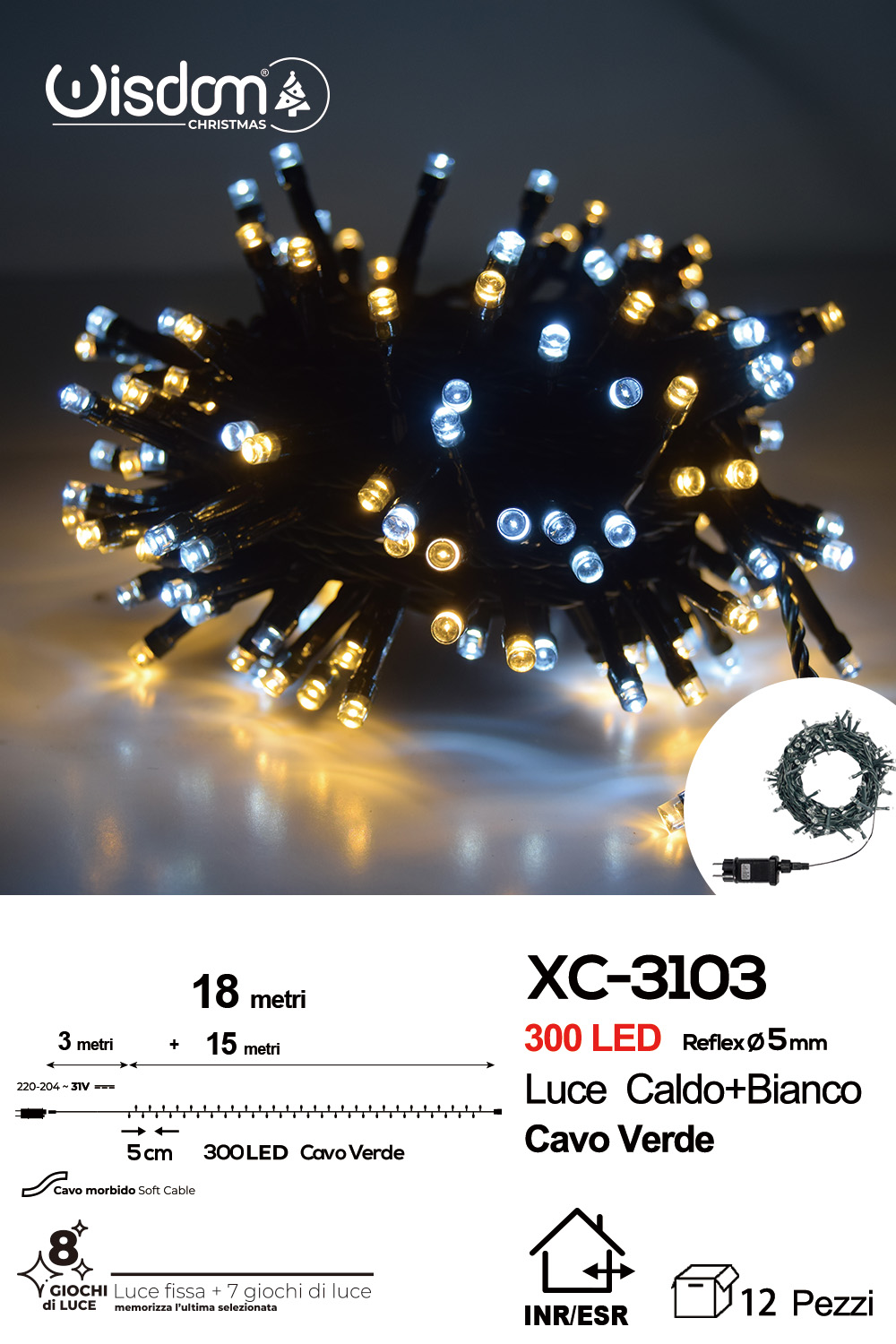 Catena luminosa 300 LED luce calda+bianca da 18 metri con 8 giochi di luce ip44 per uso interno esterno