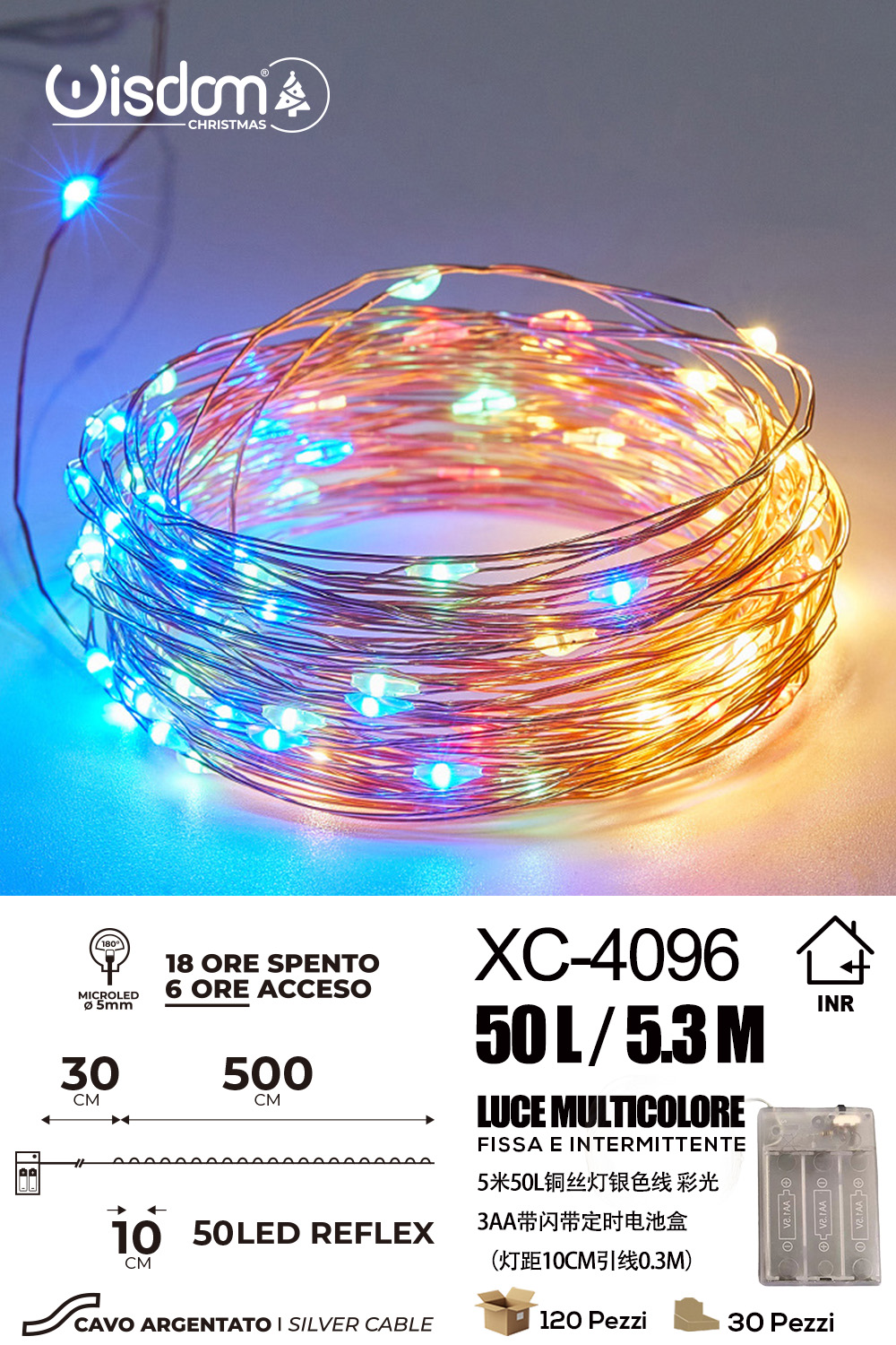 Catena luminosa 50 microLED REFLEX luce multicolor fissa e intermittente da 5,3 metri alimentazione a pile per uso interno con funzione timer on-off