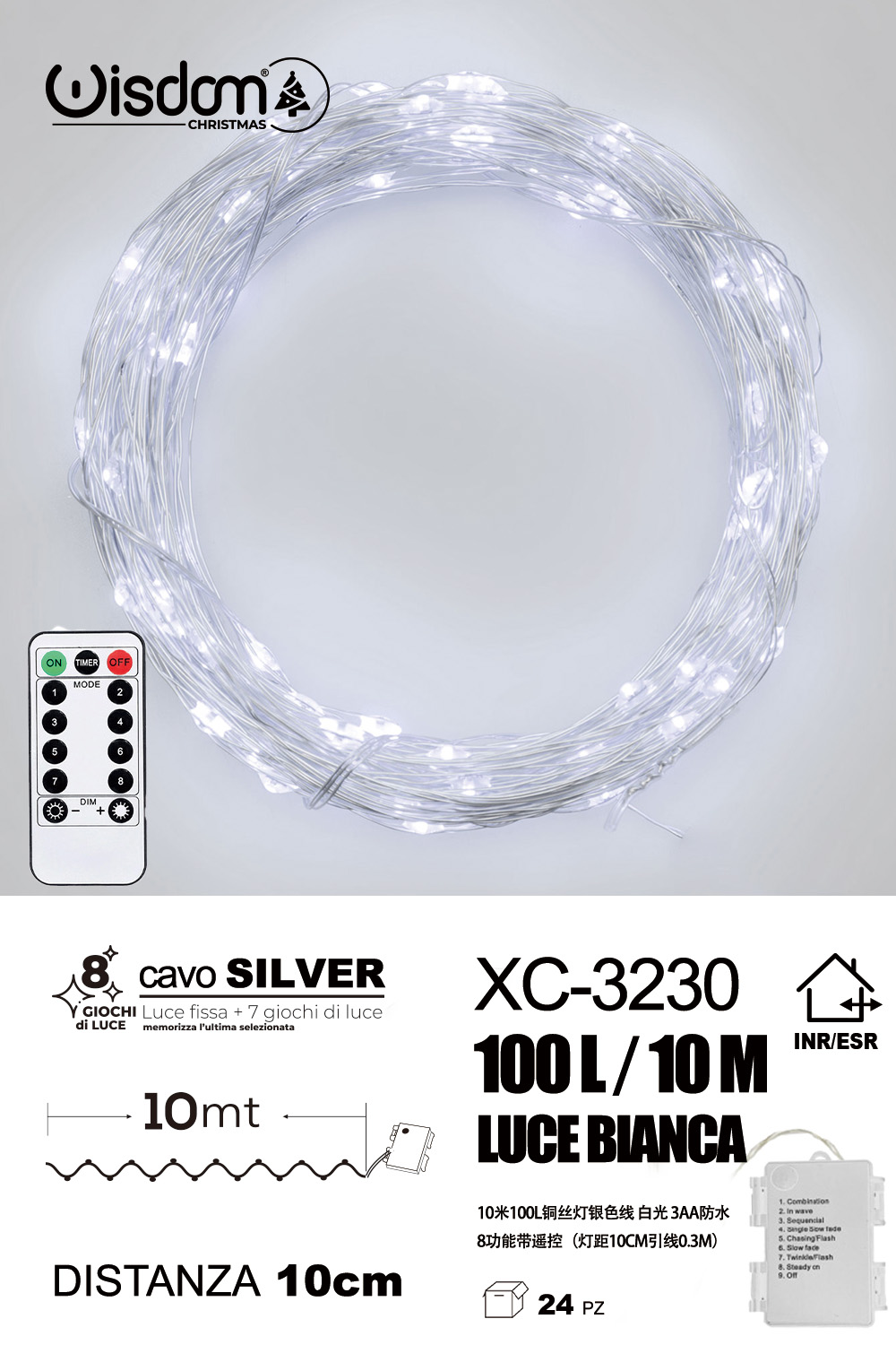 Catena luminosa con telecomando da 100 microLED luce bianca 10 metri alimentazione a pile ip44 per uso interno esterno con 8 giochi luce