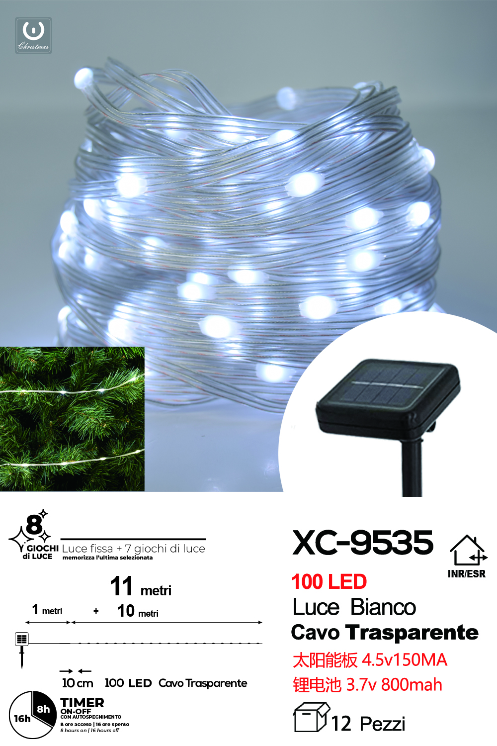 Catena luminosa da 11 metri a pannello solare picchetto 100 LED LUCE BIANCA con 8 giochi luce e funzione timer on-off