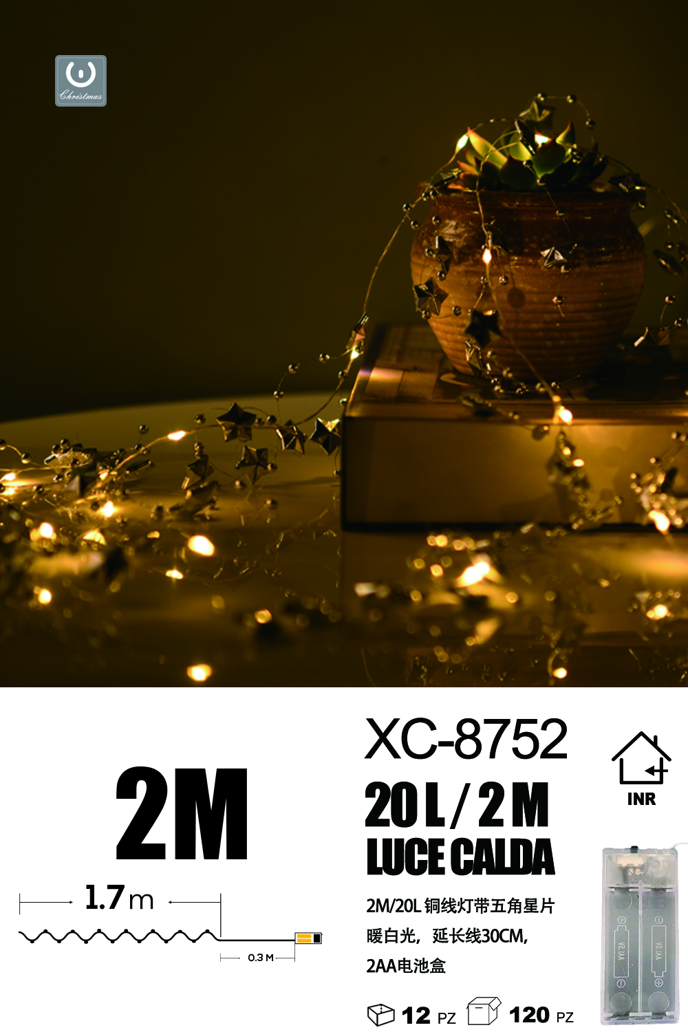 Catena luminosa decorativa da 2 metri luce calda con 20 micro LED alimentazione a batteria