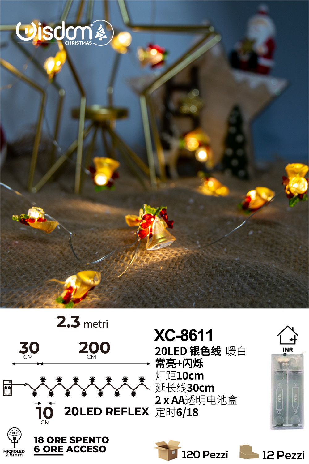 Catena luminosa decorativa da 2,3 metri luce calda fissa o lampeggiante con 20 micro LED a forma di campanelle alimentazione a batteria