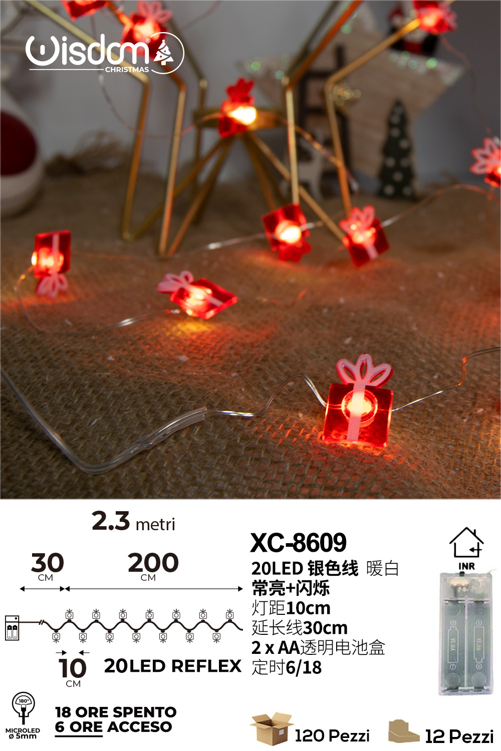 Recensisci per primo “Catena luminosa decorativa da 2,3 metri luce calda fissa o lampeggiante con 20 micro LED a forma di regali alimentazione a batteria”