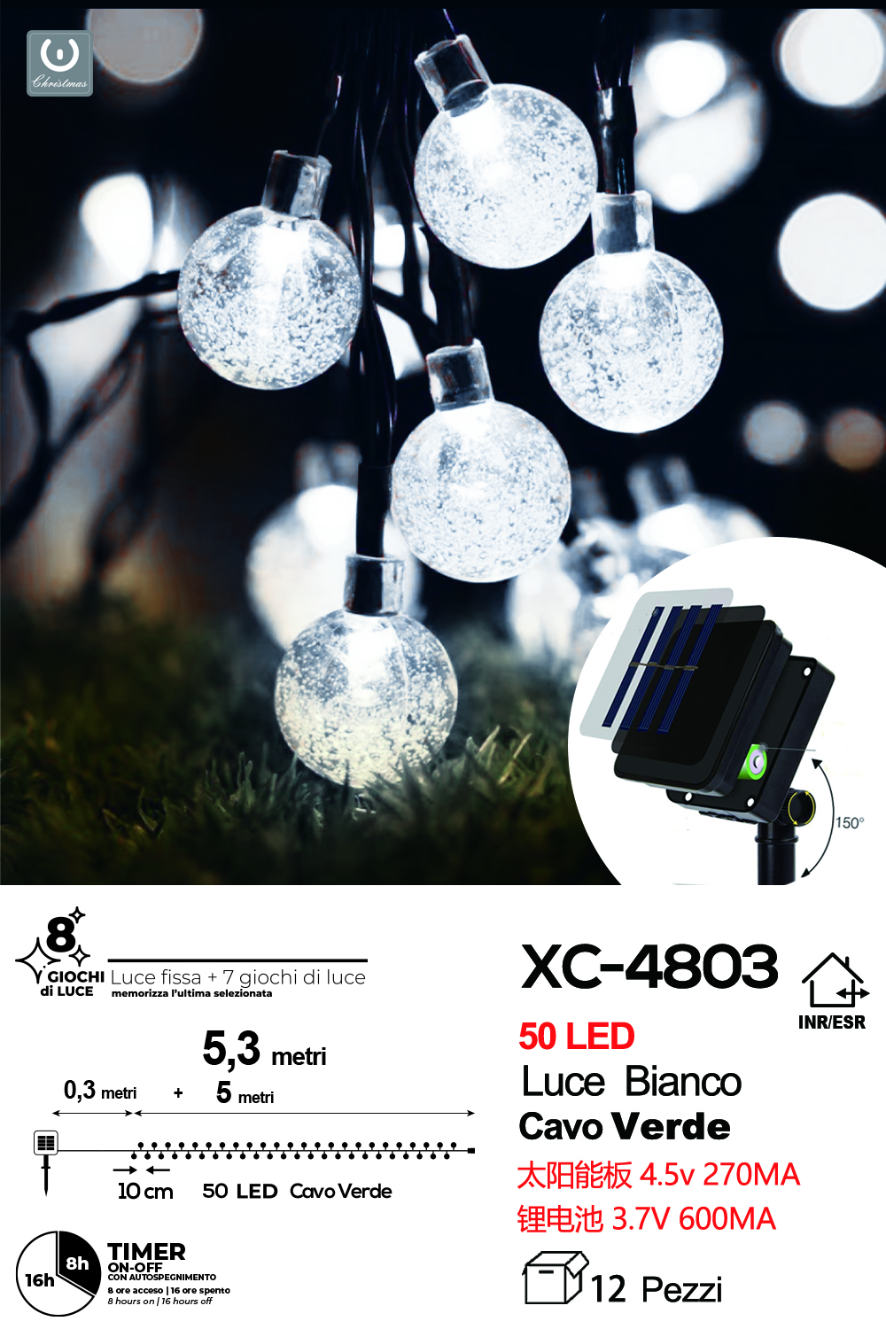 Catena luminosa decorativa pannello solare picchetto 50 sfere LED luce CALDA con 8 giochi luce e funzione timer on-off