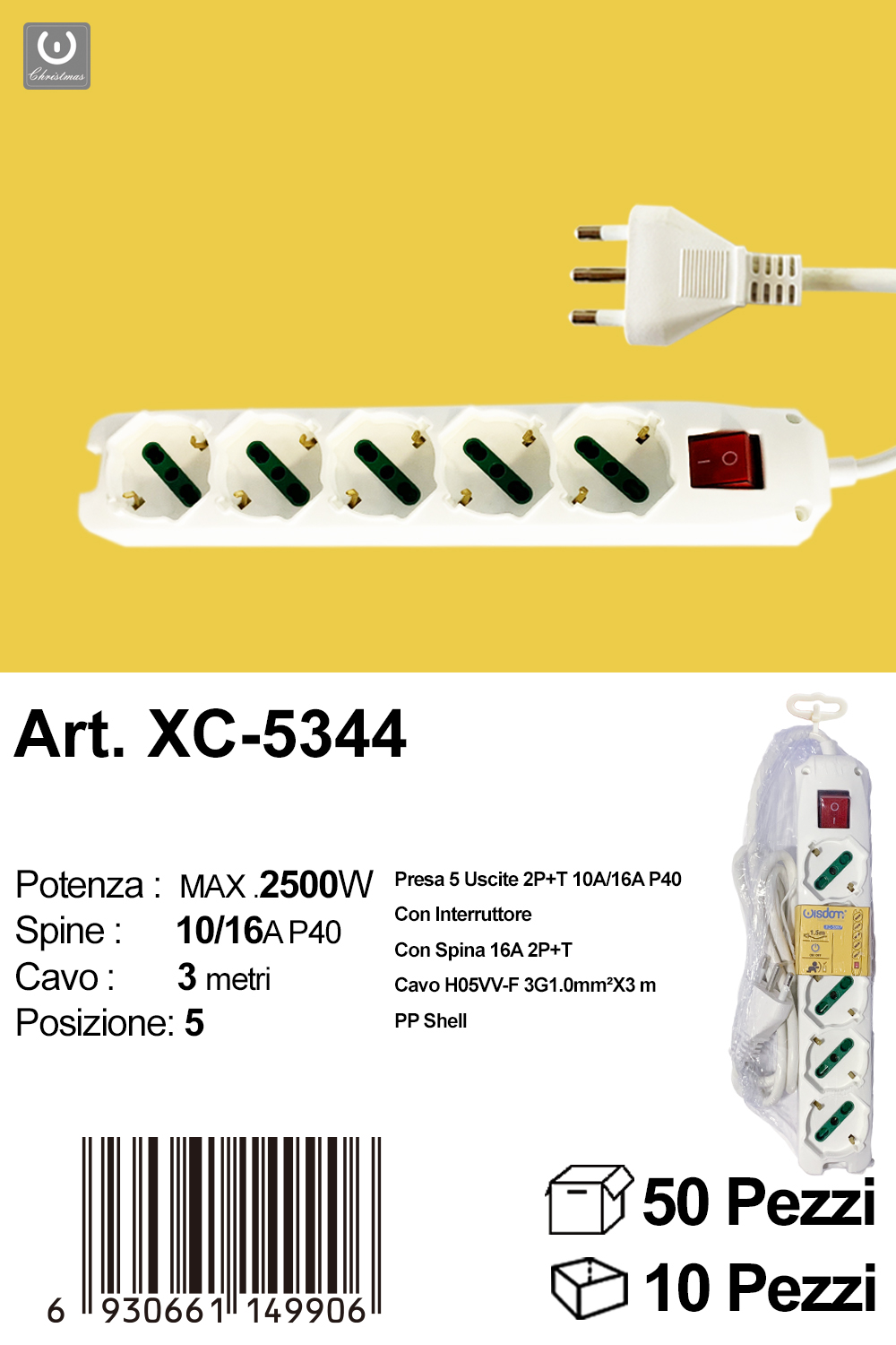 Ciabatta presa bipasso a cinque posizioni cavo da 3 metri potenza max 2500w con prese uscite da 10 e 16A