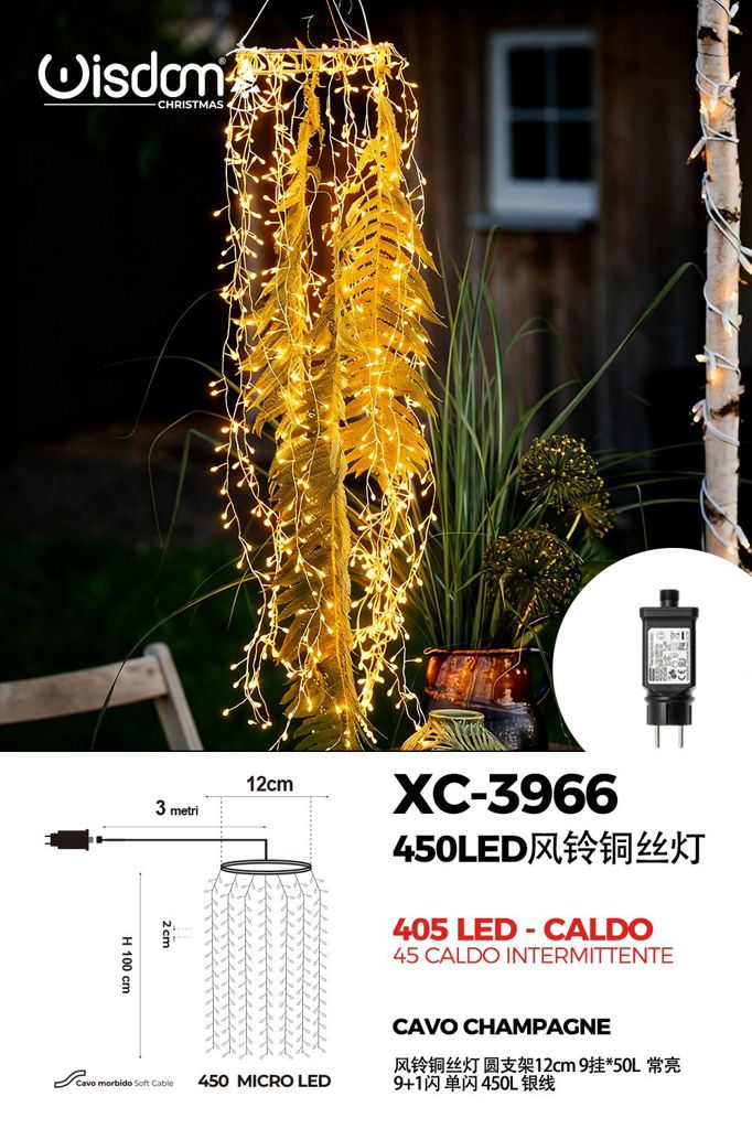 Decorazione luminosa Campanella a Vento a filo di rame argento 450 LED Caldo+caldo intermittente con staffa rotonda da 12 cm, H 100 cm