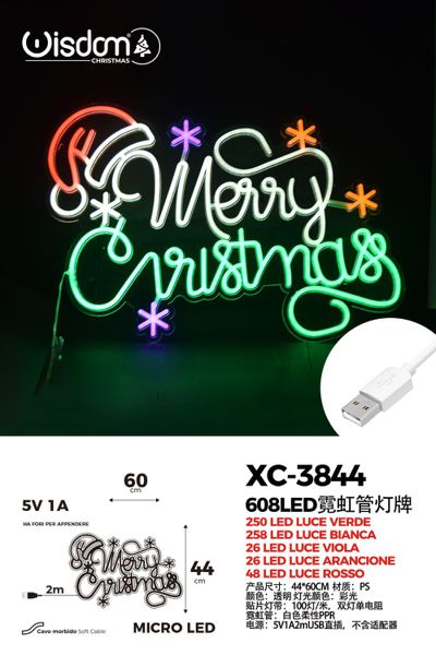 Figura luminosa Merry Christmas 608 LED Verde Bianco Viola Arancione Rosso,44×60 cm,attacco USB