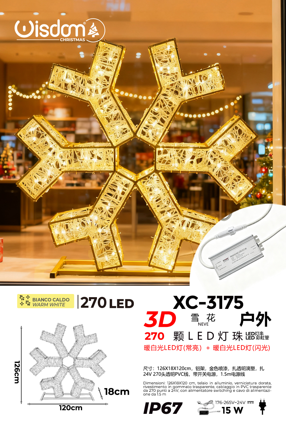 Fiocco di neve 3D con 270 LED luce calda fissa e lampeggiante dimensioni 126x18x120cm protezione grado IP67 indicato per uso esterno