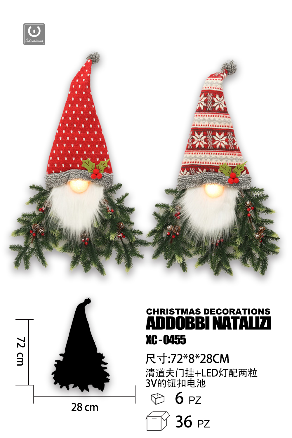 Fuoriporta Natalizio cappello da gnomo dimensioni 72x28cm con luce calda a LED alimentazione a 2 batterie (non incluse)