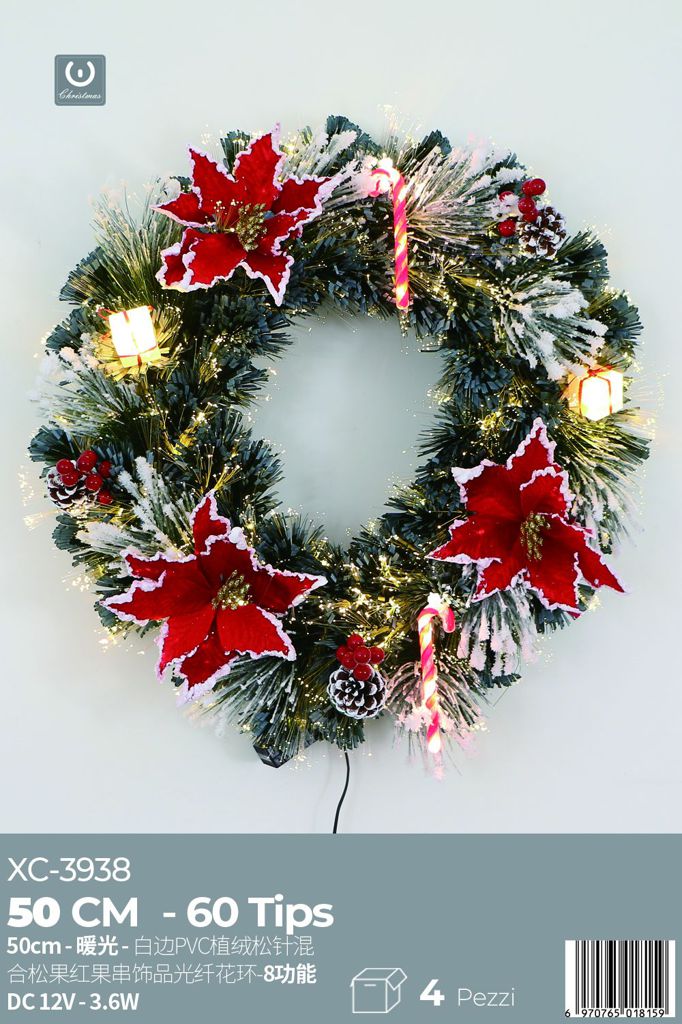 Ghirlanda in fibra ottica con aghi di pino, pigne miste , decori rossi, bordo bianco, luce Calda , 50 cm , 60 punte