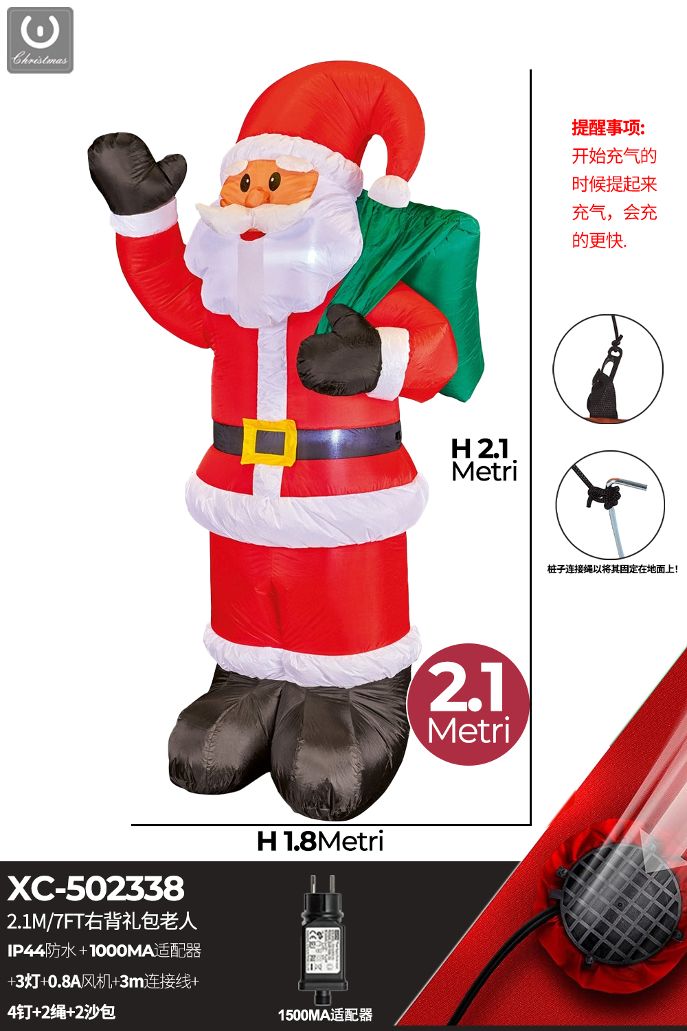 Gonfiabile Natalizio a forma di Babbo Natale che saluta con luci altezza 2,1 metri IP44 adatto per uso esterno
