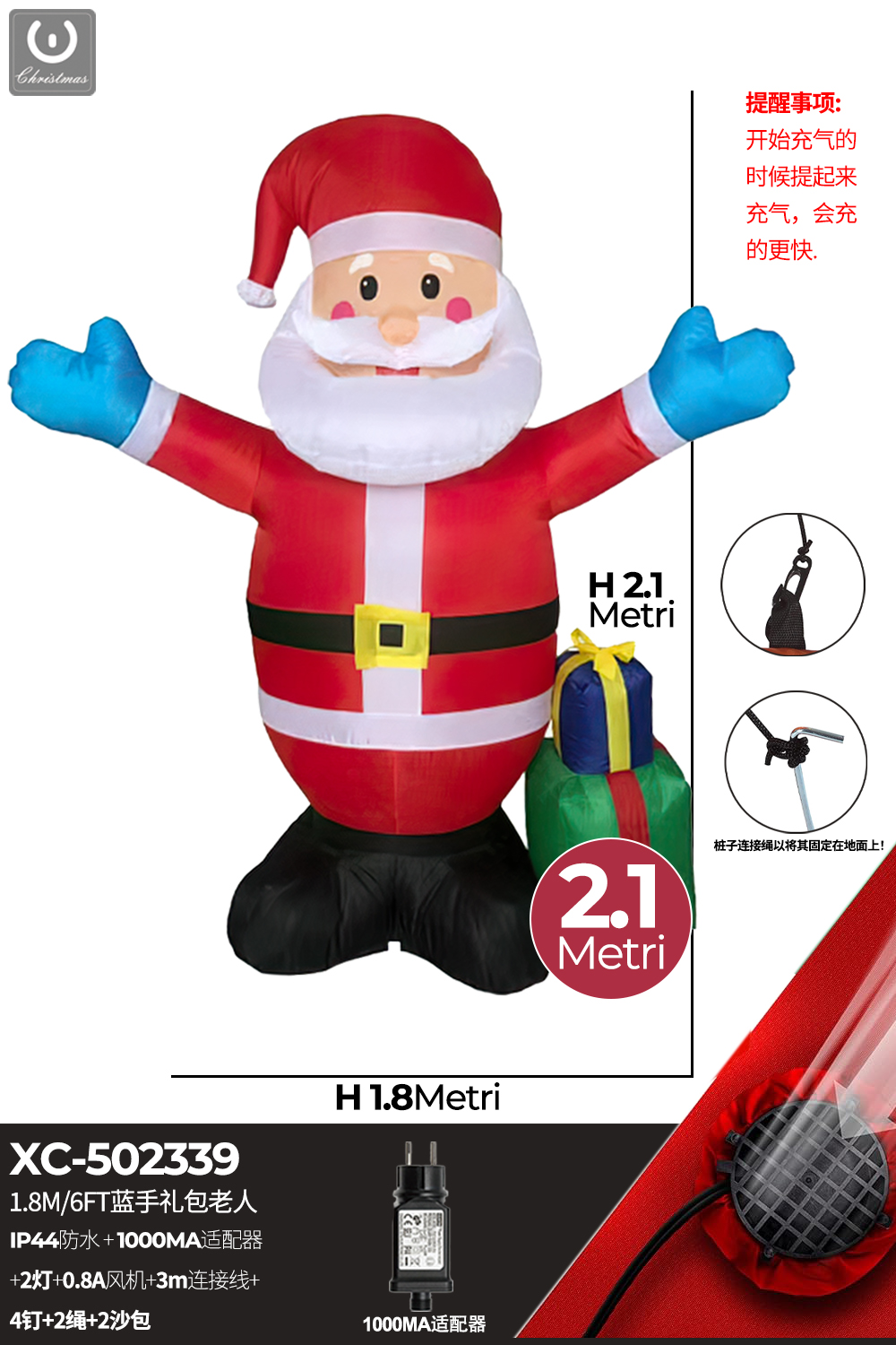 Gonfiabile Natalizio a forma di Babbo Natale con luci altezza 2,1 metri IP44 adatto per uso esterno
