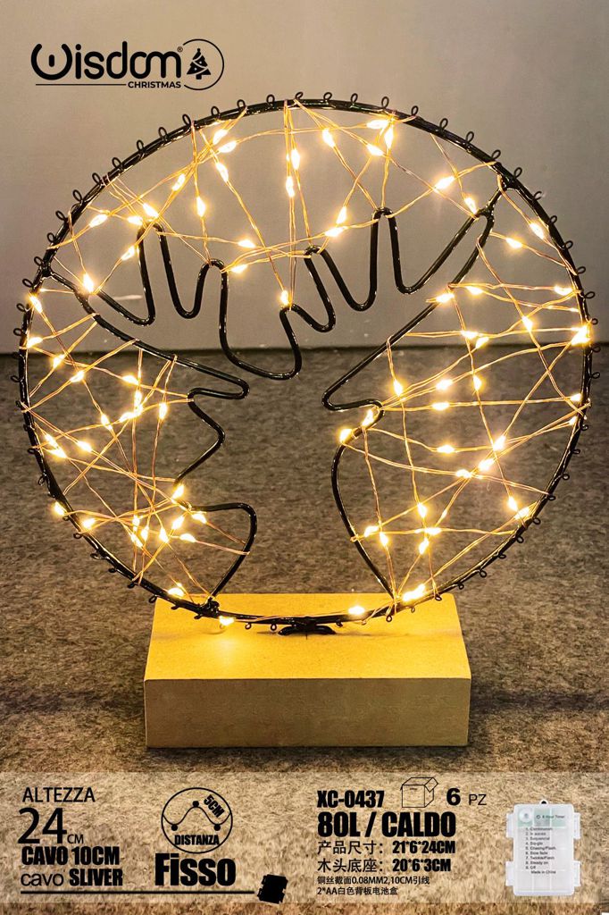 Recensisci per primo “Lampada circolare Testa di Cervo cavo Argento,80 LED luce Calda, base in Legno , H 24 cm, vano batterie”