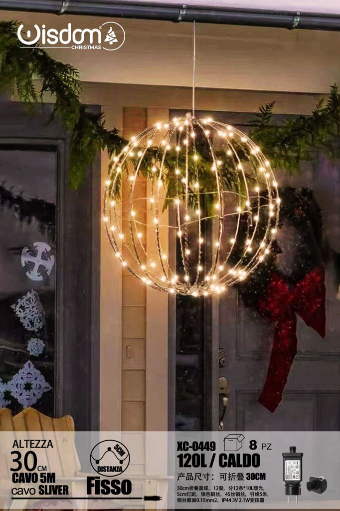 Lampada pieghevole a Sfera con filo di rame argentato , 120 LED luce Calda, 30 cm di diametro