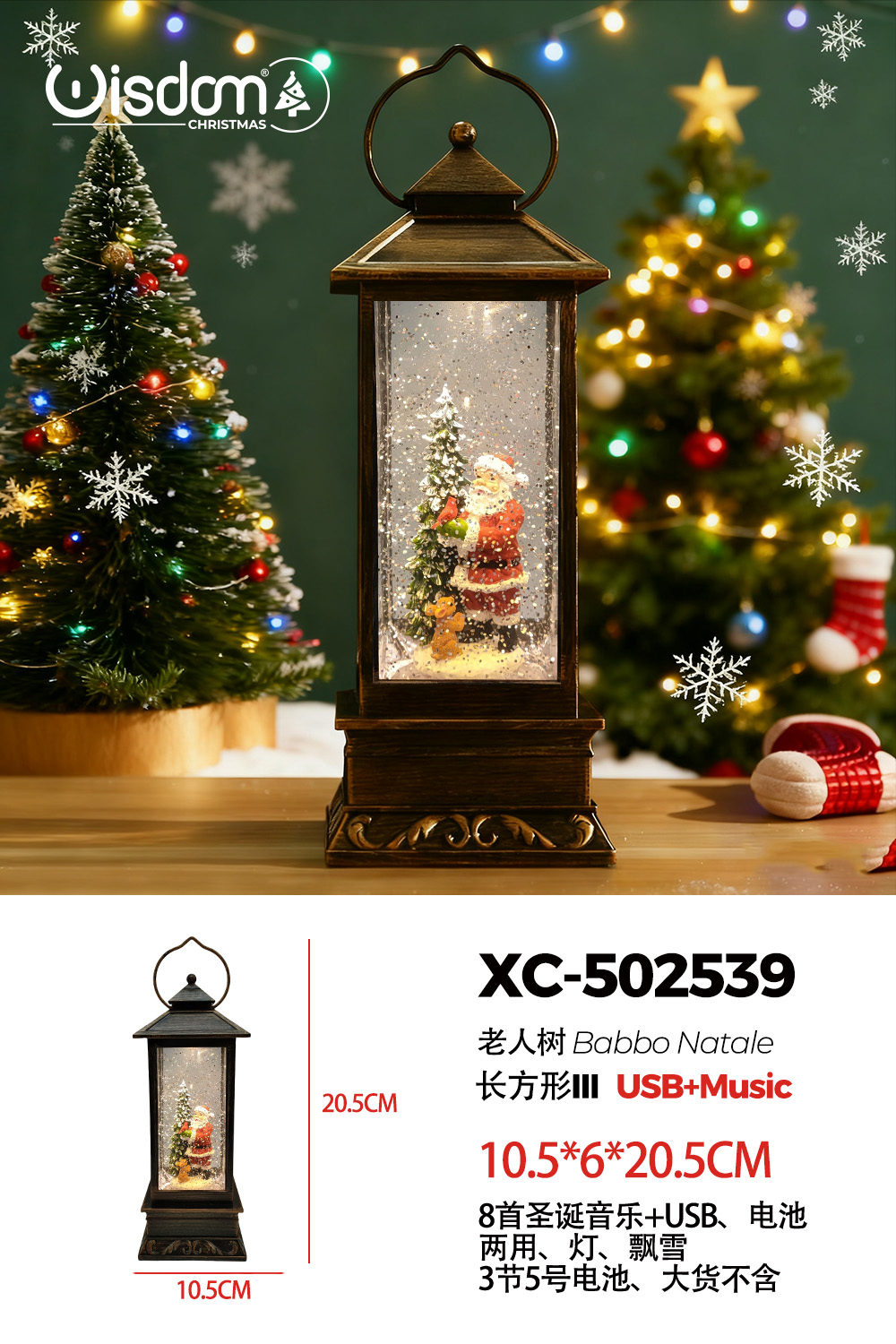 Lanterna Natalizia a gancio con neve che cade tema babbo Natale carillon luci 8 musiche Natalizie+Ingresso USB (20,5cmH) alimentazione a batterie