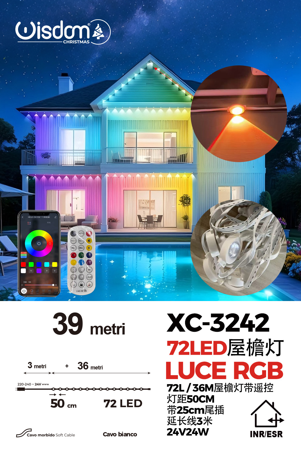 Luce striscia luminosa di grondaia con 72 LED RGB lunghezza 39 metri