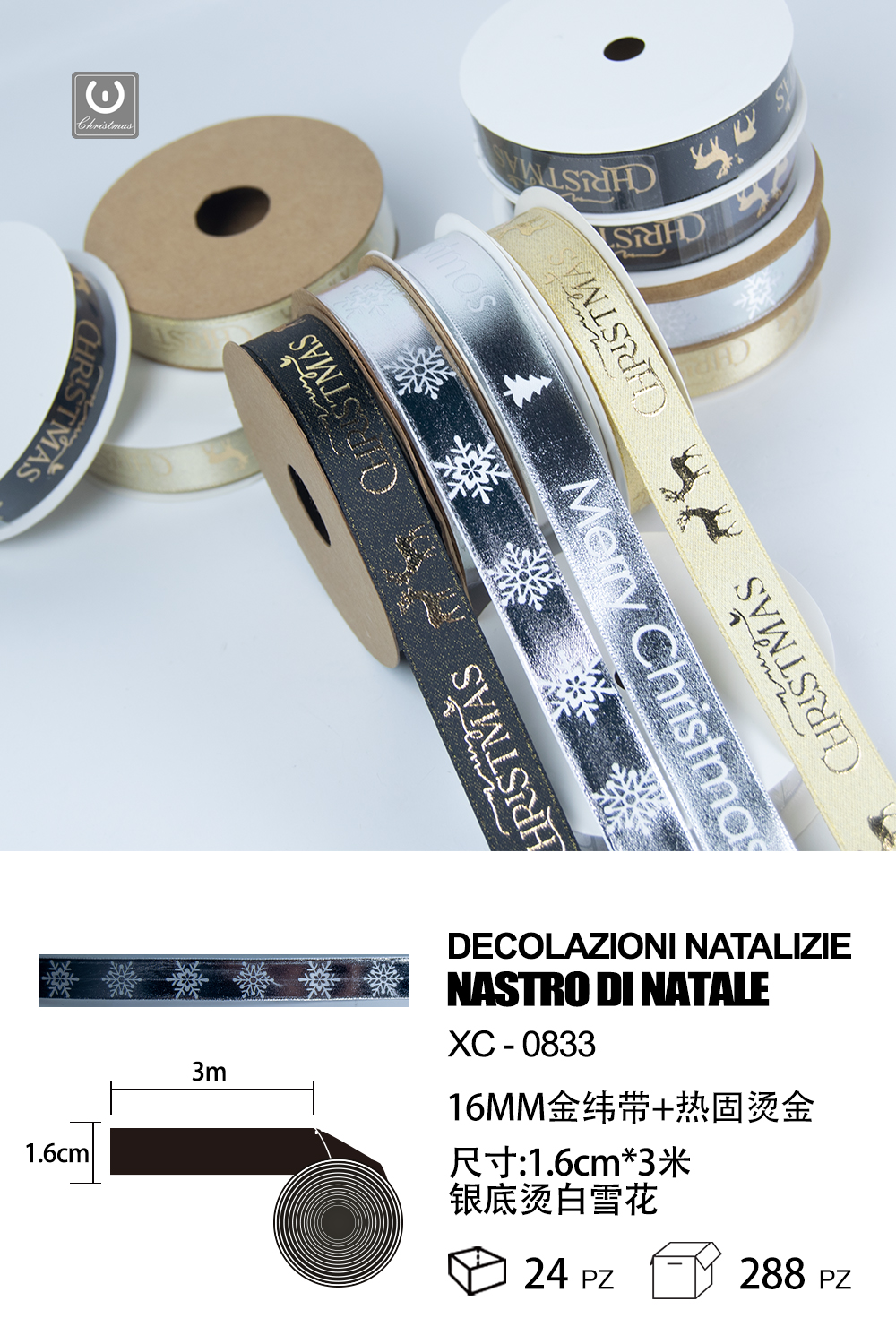 Nastro natalizo decorativo color argento con fiocchi di neve materiale poliestere dimensioni 1,6 cm x 3 mt