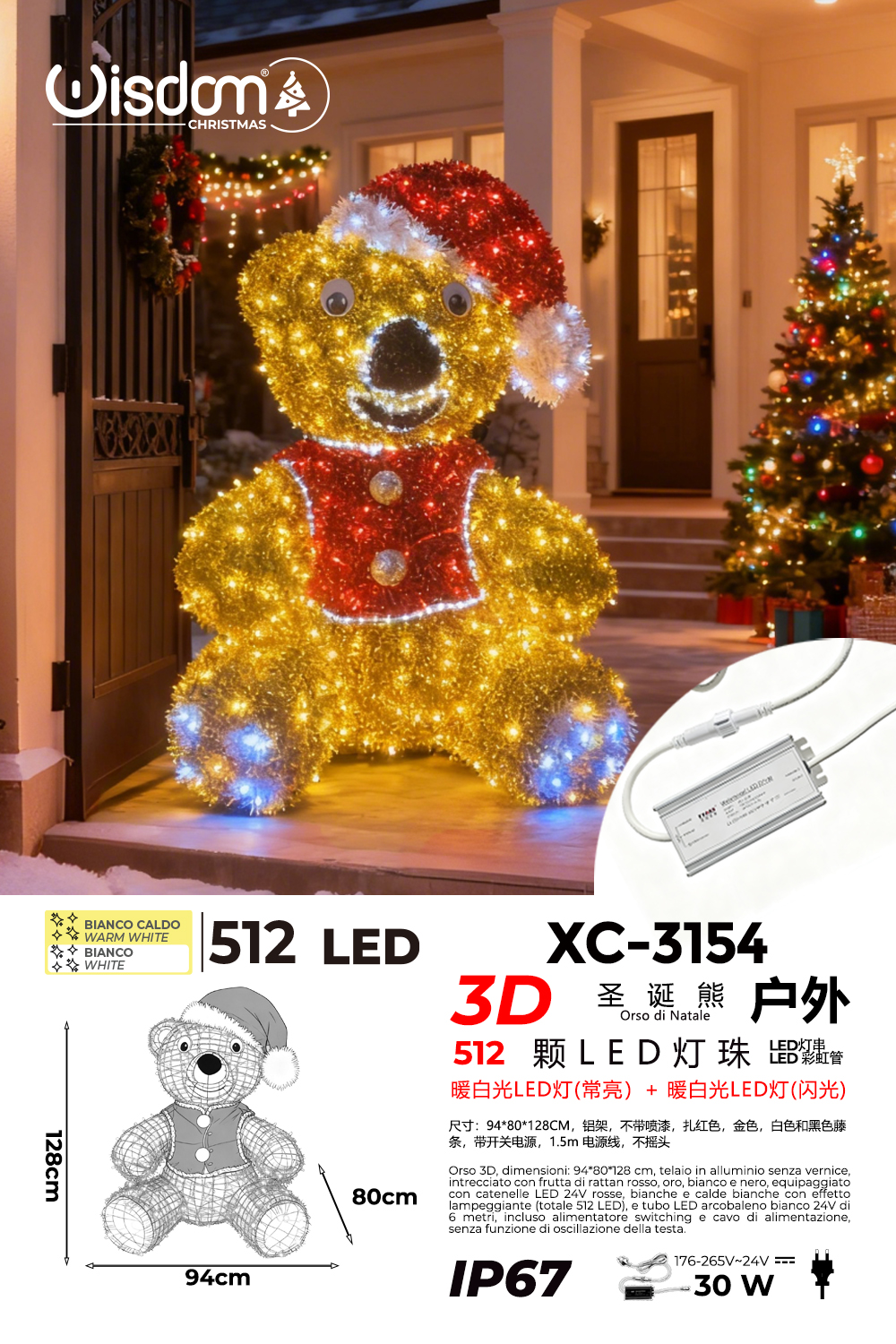 Orso di Natale 3D con 512 LED luce calda fissa e lampeggiante potenza 30w dimensioni 94x80x128cm protezione grado IP67 indicato per uso esterno