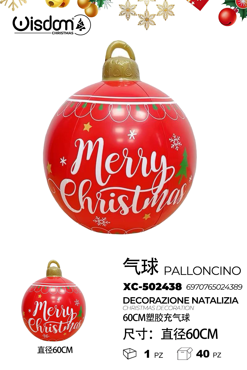 Palla gonfiabile Natalizia con scritta Merry Christmas in plastica pvc con diametro di 60cm indicato per decorazioni natalizie uso interno o esterno