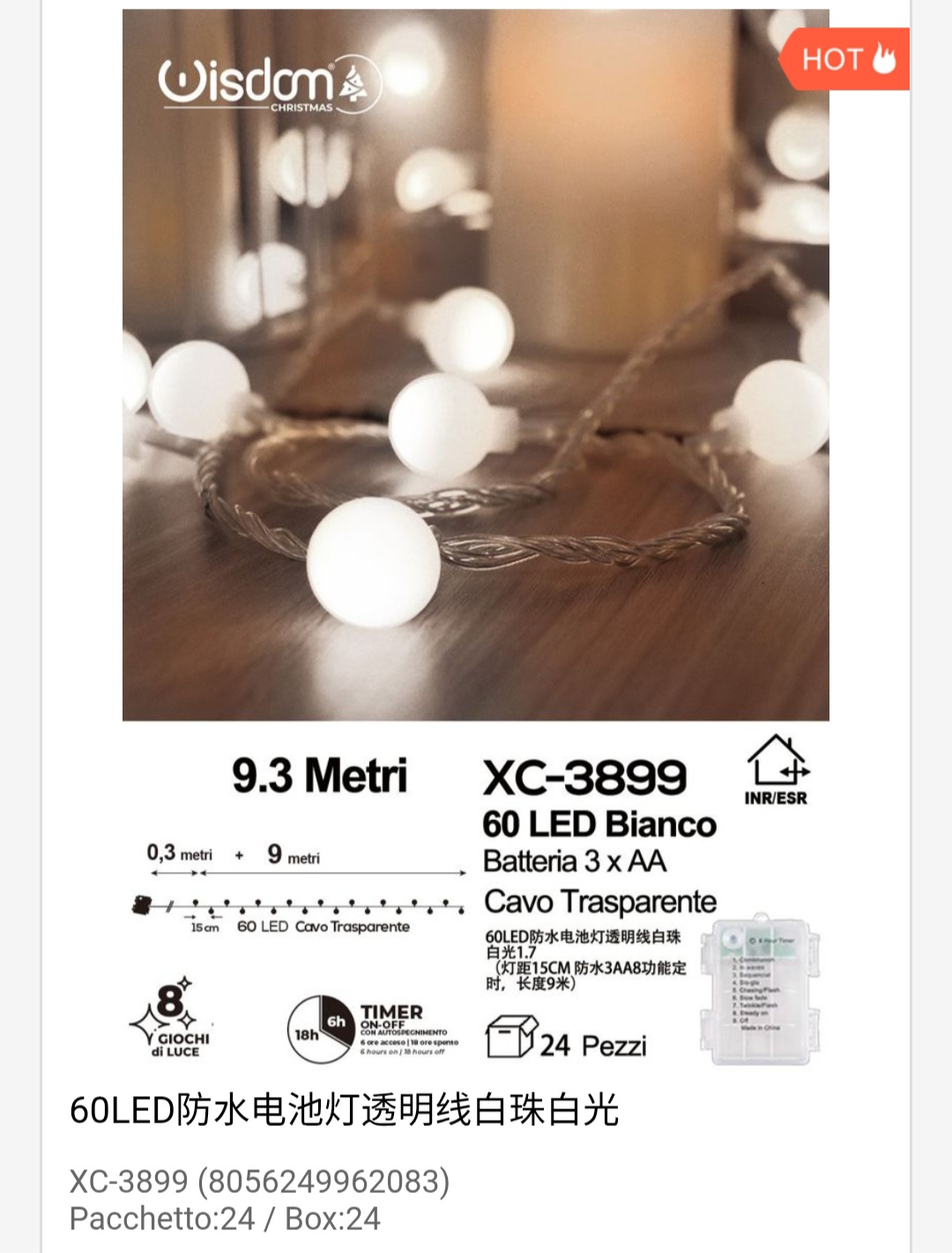 Pendente luminoso Natalizio 9,3 metri a forma di perle luminose 60 LED luce fredda alimentazione a batterie (non incluse) uso interno/esterno