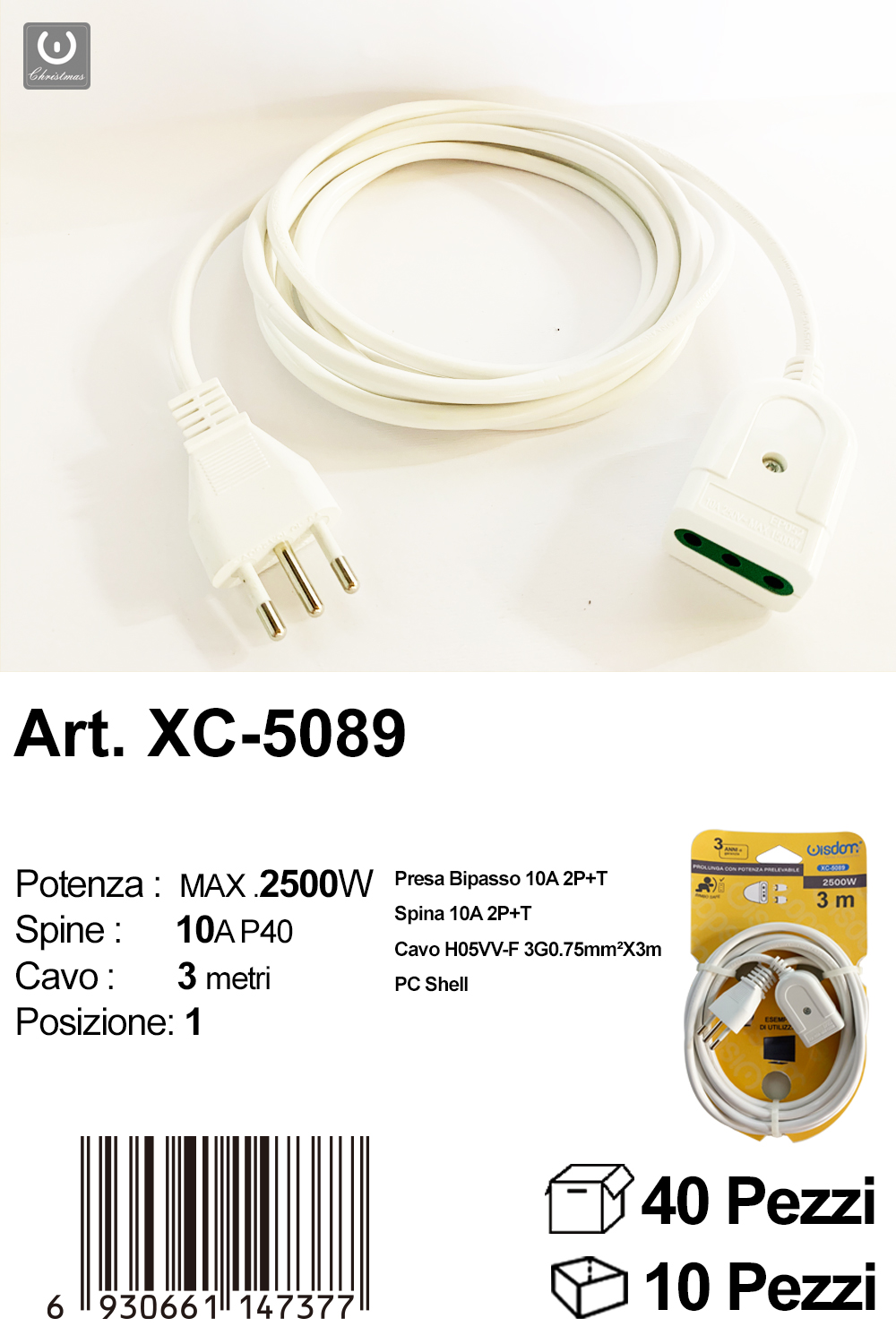 Prolunga elettrica bipasso bianca cavo da 5 metri potenza massima 2500W