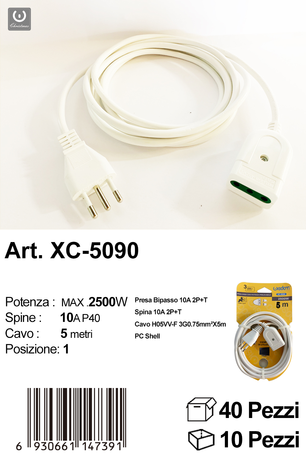 Prolunga elettrica bipasso bianca cavo da 5 metri potenza massima 2500W