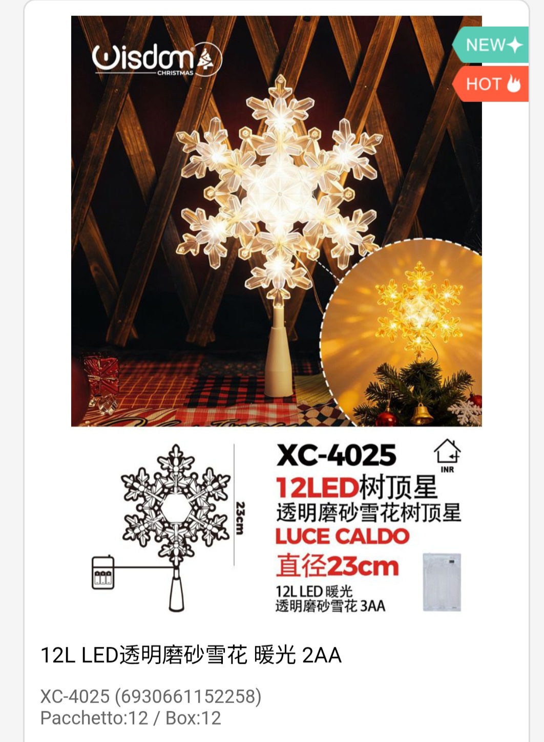 Puntale luminoso a forma fiocco di neve per albero di Natale luce 12 LED calda fissa dimensione 23cmH alimentazione a batteria