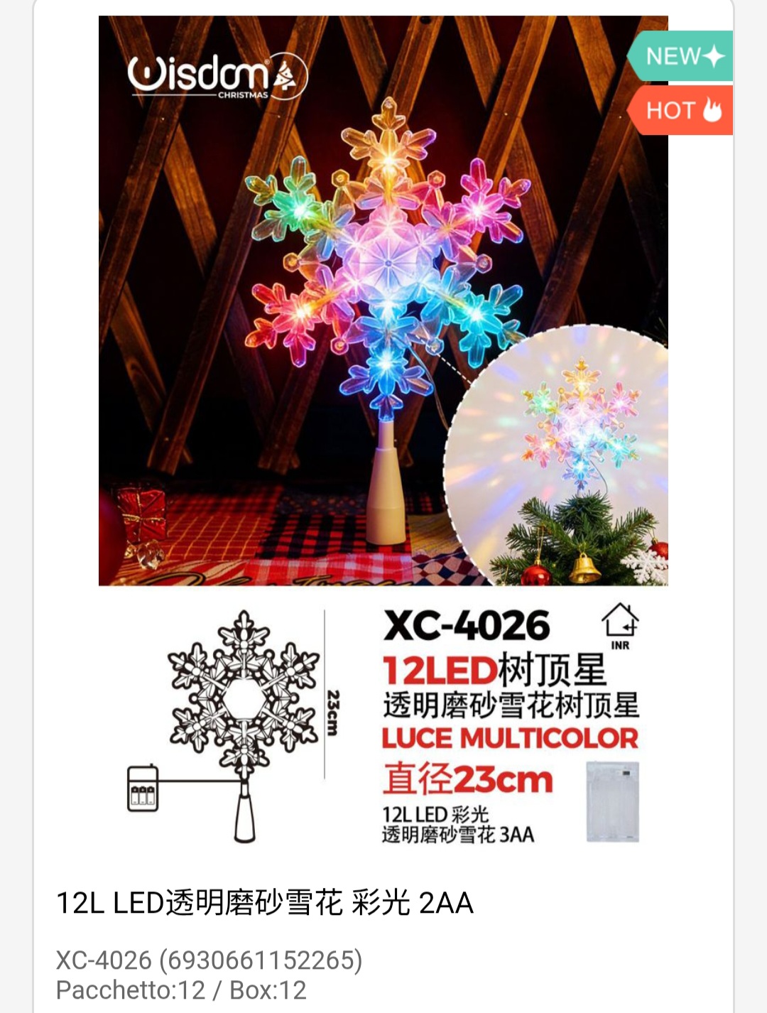 Puntale luminoso a forma fiocco di neve per albero di Natale luce 12 LED multicolor fissa dimensione 23cmH alimentazione a batteria
