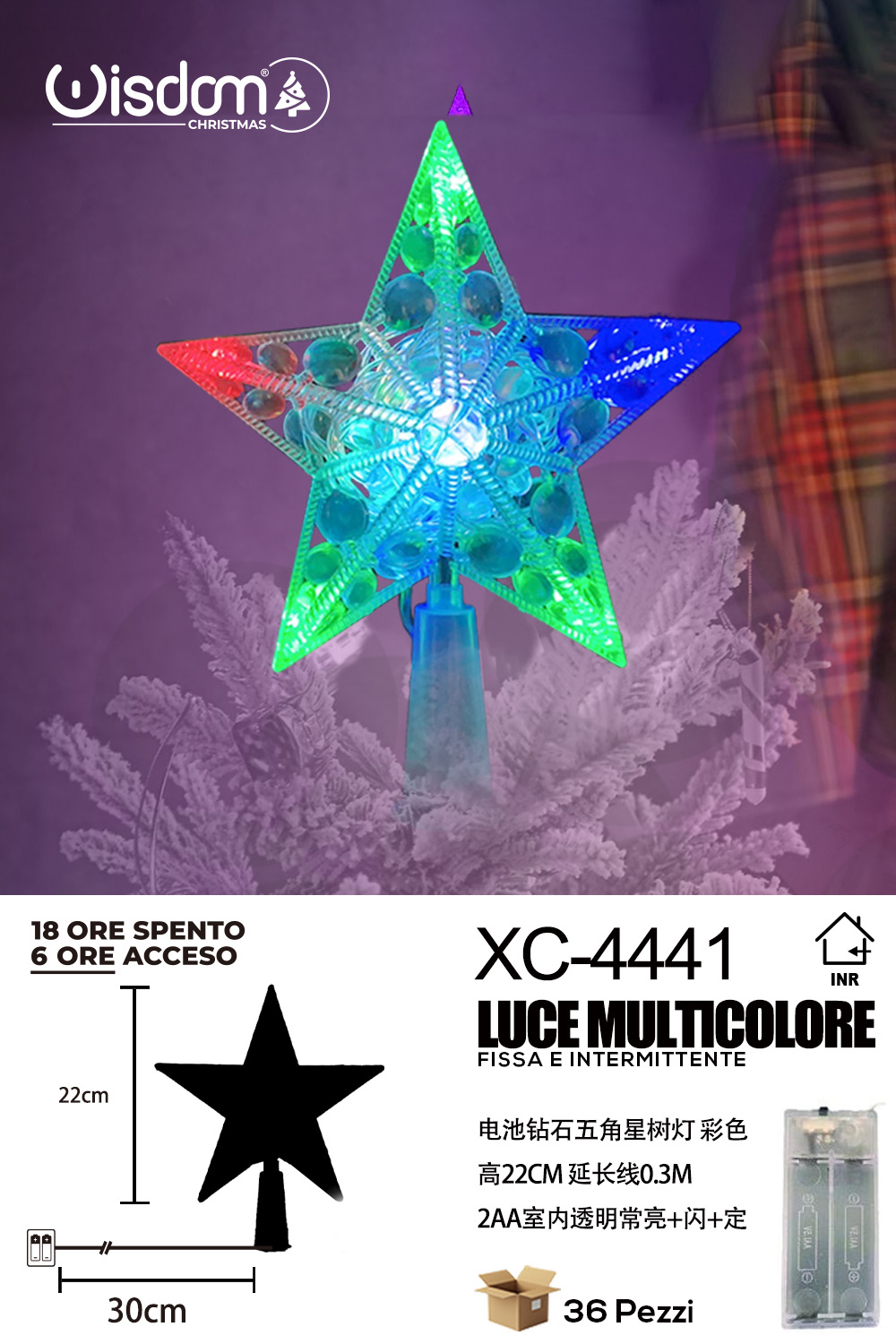 Puntale luminoso a stella per albero di Natale a LED con luce multicolor fissa e intermittente dimensioni 22x30cm alimentazione a batteria