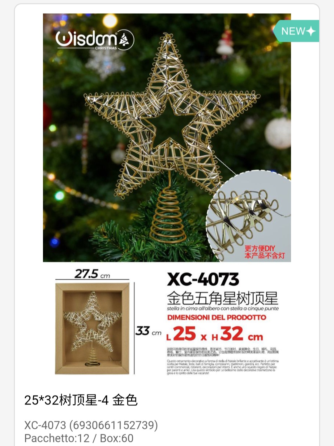 Puntale per albero natalizio a forma di stella spirale color oro dimensione 25x32cm