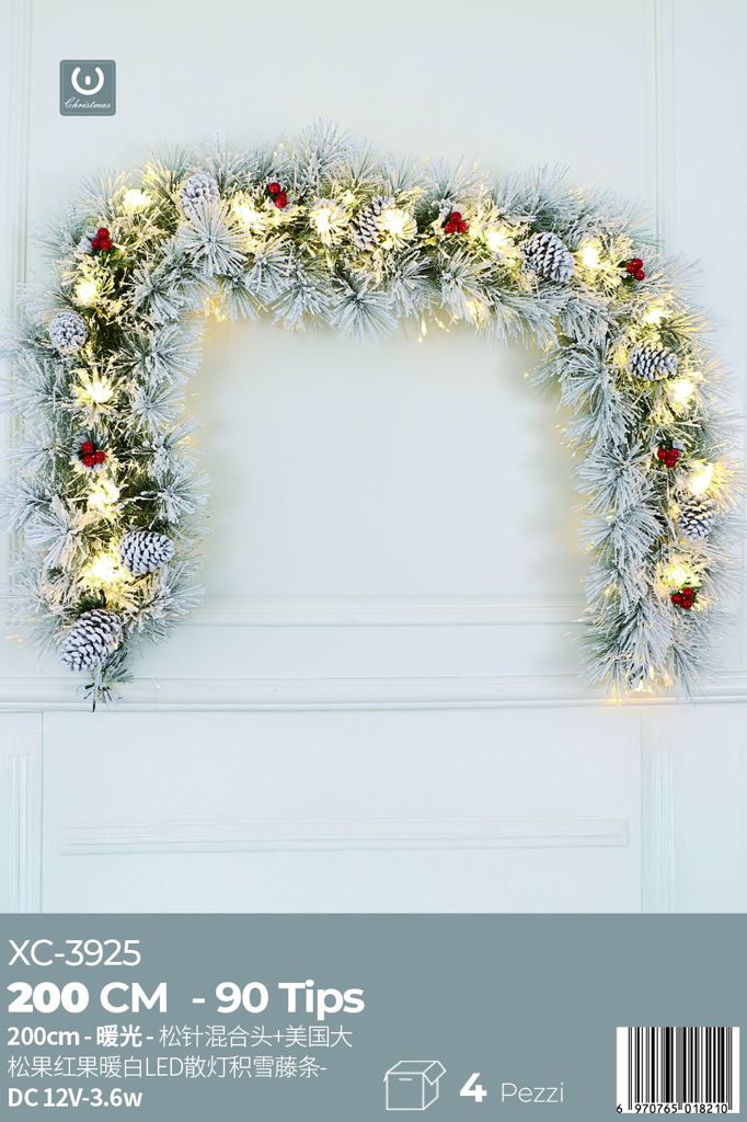 Ramo di aghi di pino 2mt, 90 punte, luce Calda+ diffusero Led Caldo , pigne americane ,rifiniture di vite innevata