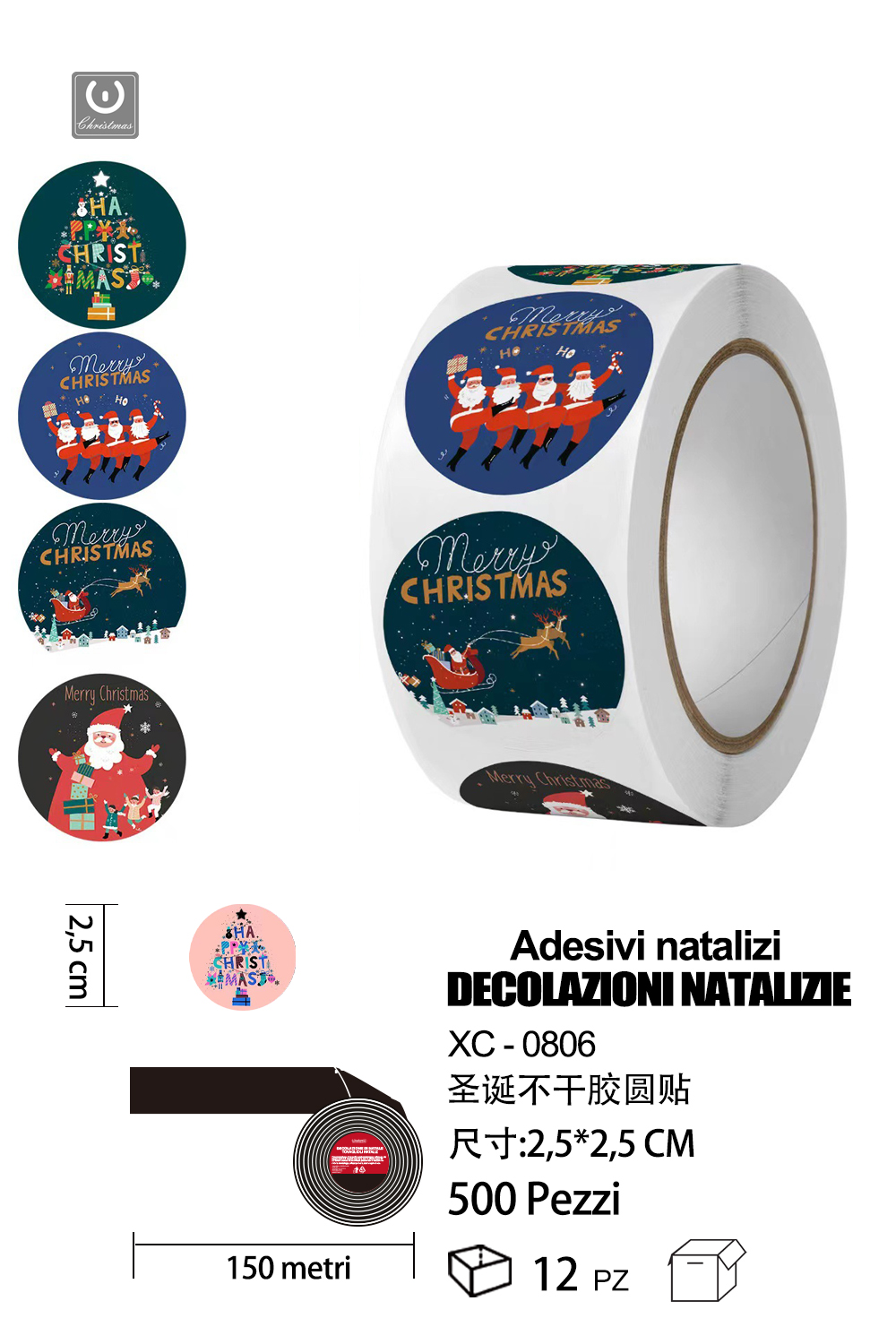 Rotolo etichette adesive natalizie 500 pz vari motivi natalizi babbo natale merry christmas dimensioni 2,5×2,5cm