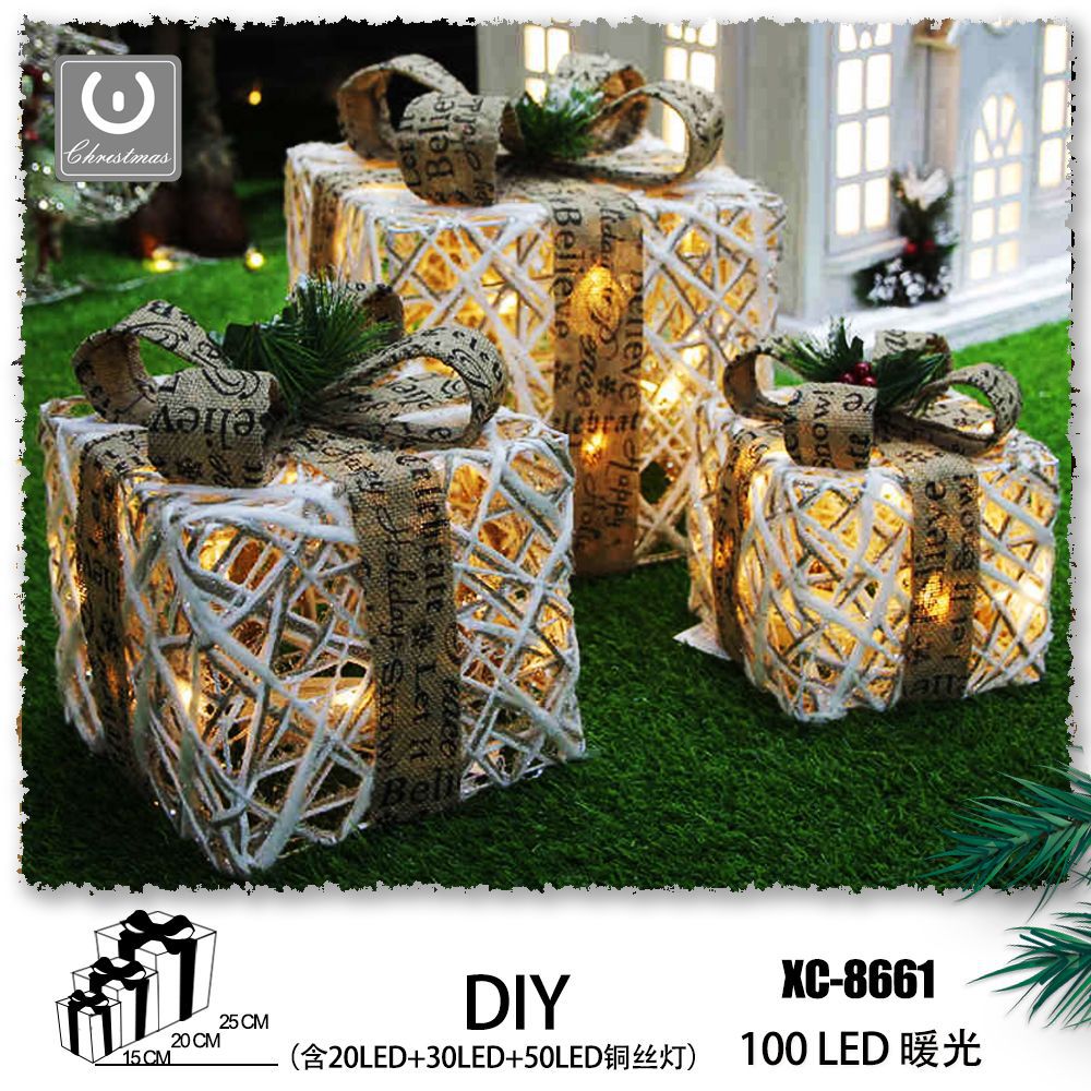 Scatole regalo luminose set 3 pz , luce Calda, 100 LED, scatola bianca in corda , 15 cm , 20 cm , 25 cm