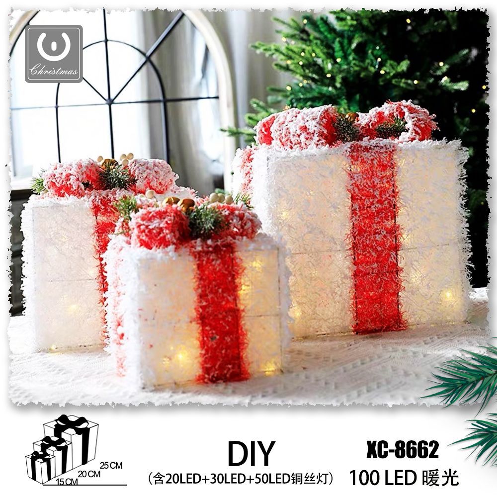 Scatole regalo luminose set 3 pz , luce Calda, 100 LED, scatola innevata , 15 cm , 20 cm , 25 cm