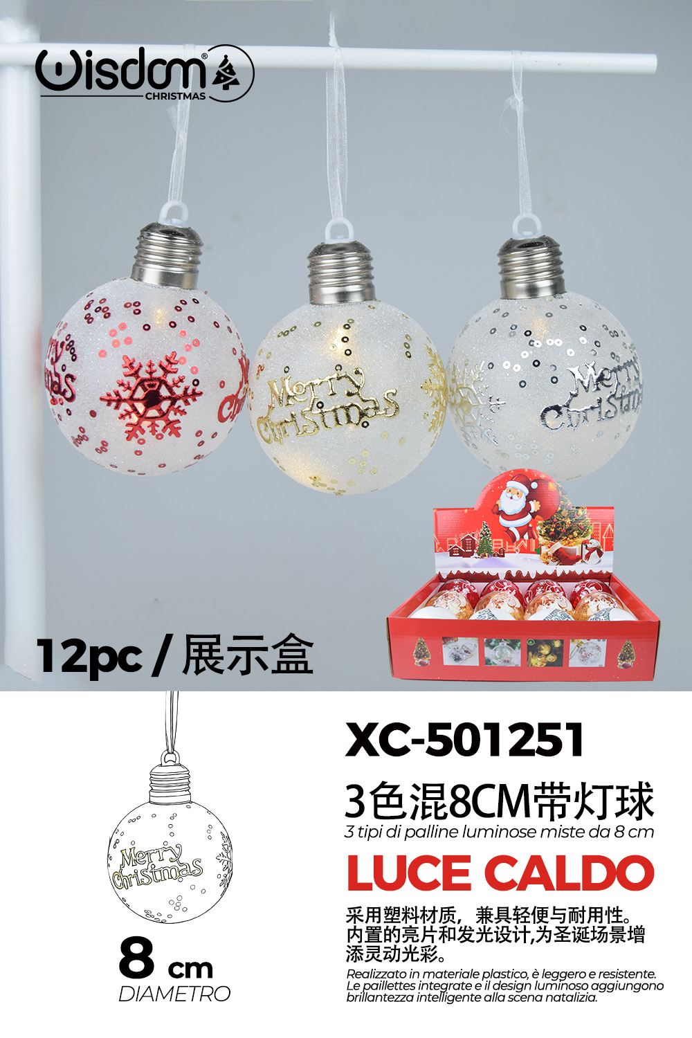 Set 12 palline decorative natalizie in plastica bianche con decorazioni natale luce LED calda diametro 8cm