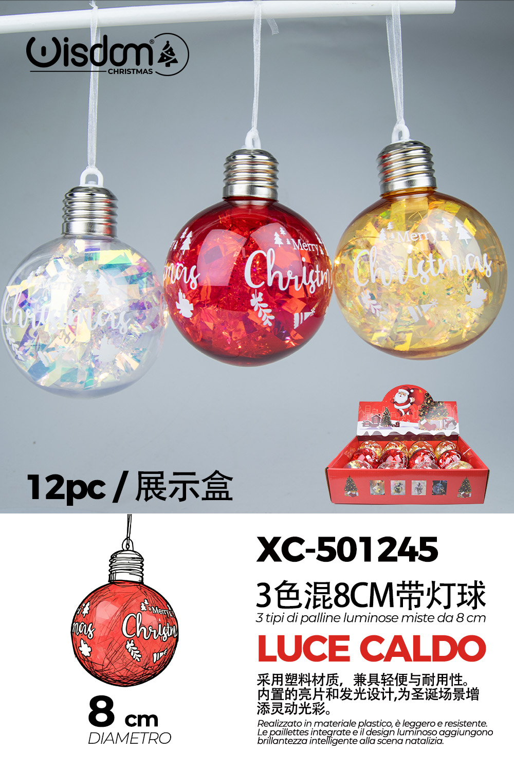 Set 12 palline decorative natalizie in plastica colori misti con scritta merry christmas luce LED calda diametro 8cm