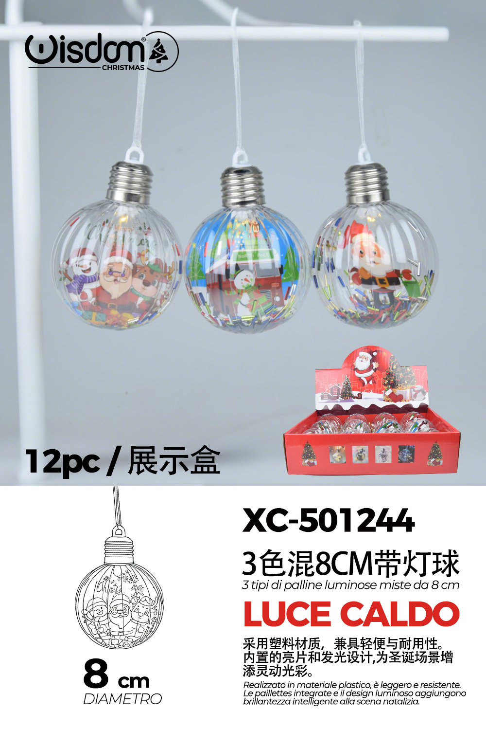 Set 12 palline decorative natalizie in plastica con Babbo Natale luce LED calda diametro 8cm