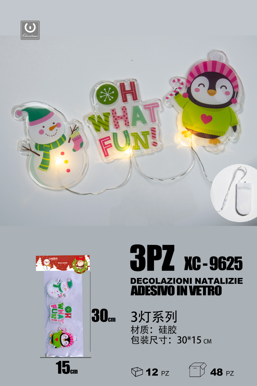 Set 3 pezzi adesivi in gel a forma personaggi natalizi con luce calda dimensioni: 30x15cm
