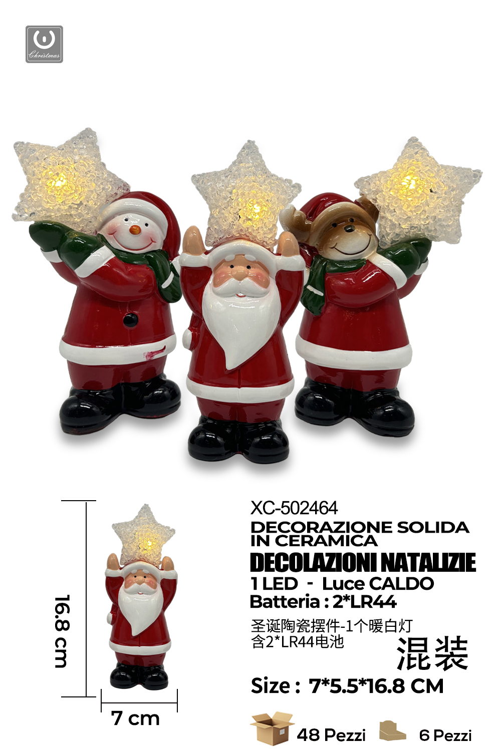Set Personaggi Natalizi in ceramica con luce LED calda dimensione 7,5x5x16,8cm alimentazione a batterie (2 non incluse)
