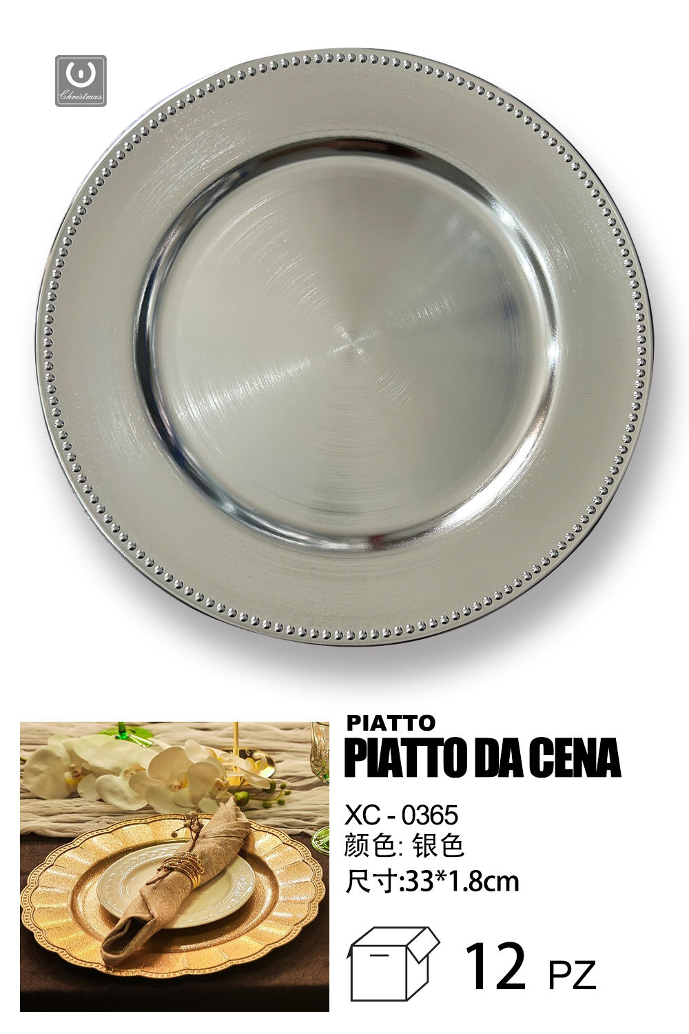 Sottopiatto Natalizio colore argento con bordo perlato per addobbi in cucina dimensioni 33×1,8cm