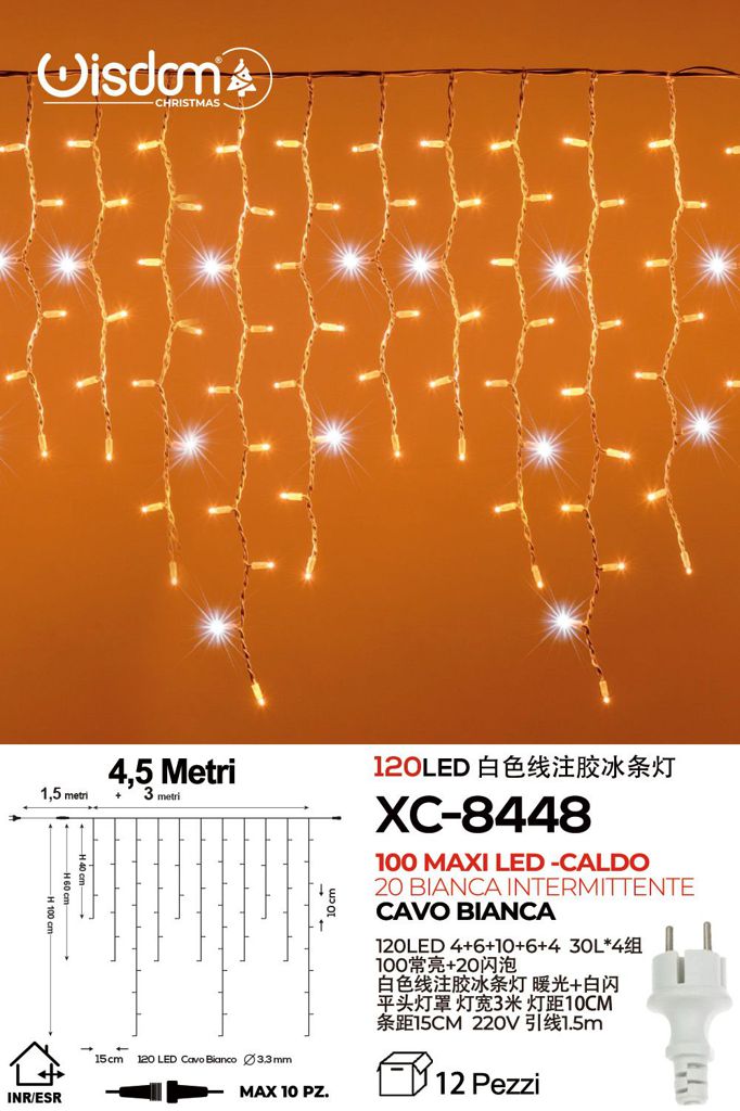 Tenda 120 MAXILED, luce caldo + bianco intermittente , 4,5 mt , cavo bianco ,collegabile max 10 pz