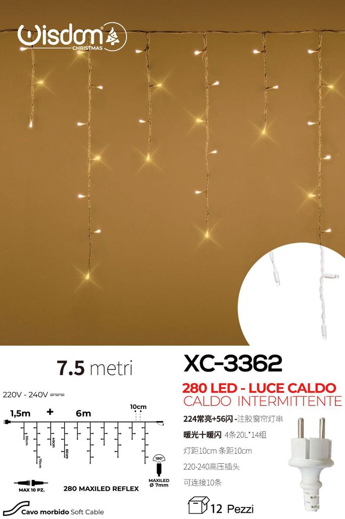 Tenda 280 LED ,luce calda + caldo intermittente, 7,5 mt, cavo bianco , collegabile max 10 pz