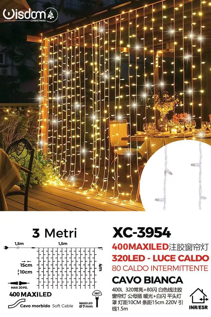 Tenda 400 MAXLED, luce caldo + caldo intermittente,3 mt , cavo bianco, collegabile max 20 pz
