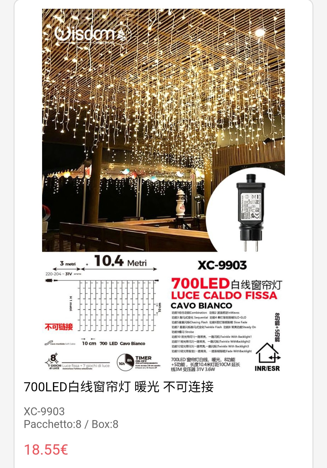 Tenda luminosa 10,4 metri con 700LED luce calda fissa ip44 per uso interno esterno con 8 giochi luce e funzione timer on-off