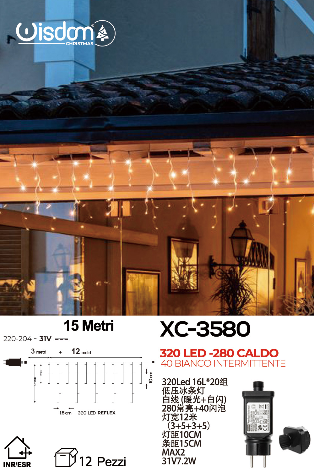 Tenda luminosa 15 metri con 320LED totali (280 luce calda fissa+40 luce intermittente bianca con flash) ip44 per uso interno esterno