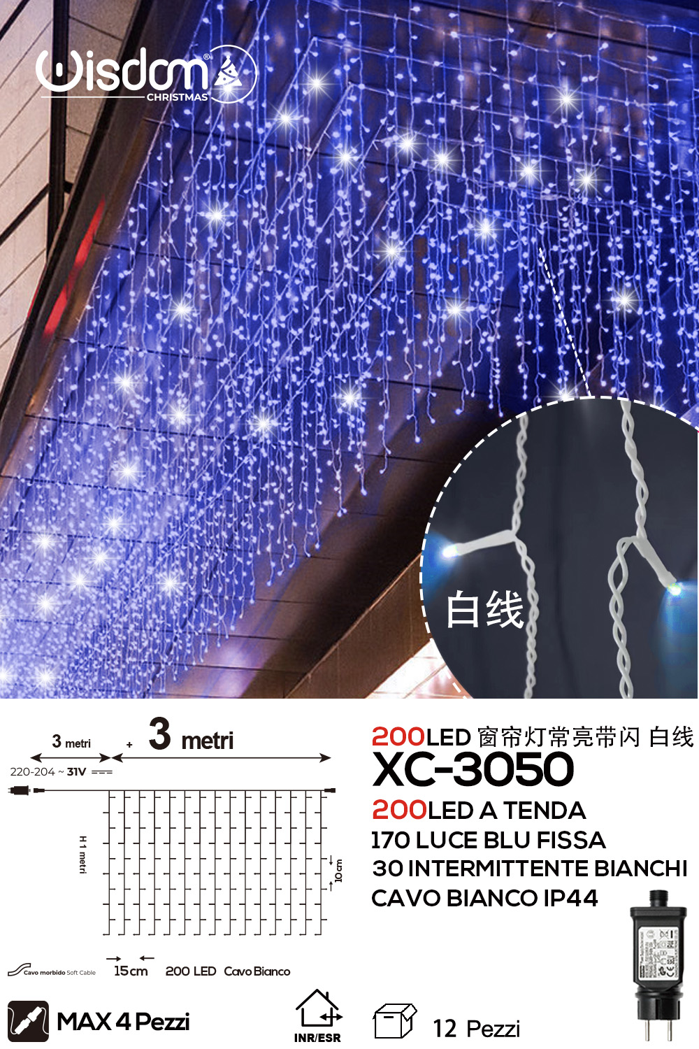 Tenda luminosa 3 metri con 200 LED totali (170 luce blu fissa+30 luce intermittente bianca con flash) ip44 per uso interno esterno