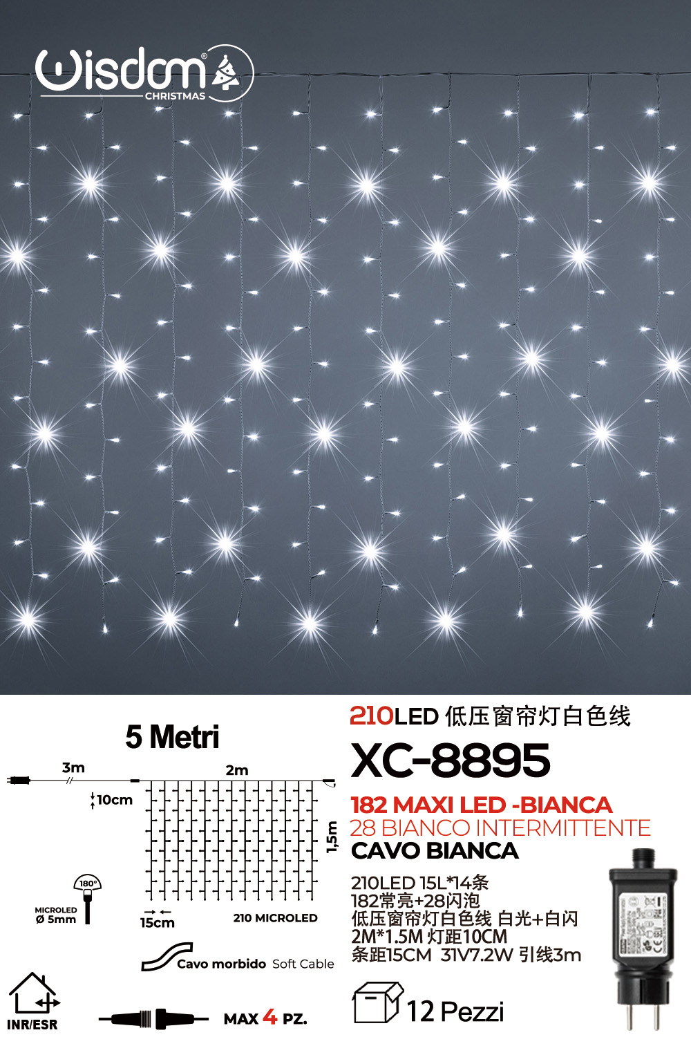 Tenda luminosa 5 metri con 210MAXI LED totali (182 luce bianca fissa+28 luce intermittente bianca con flash) ip44 per uso interno esterno