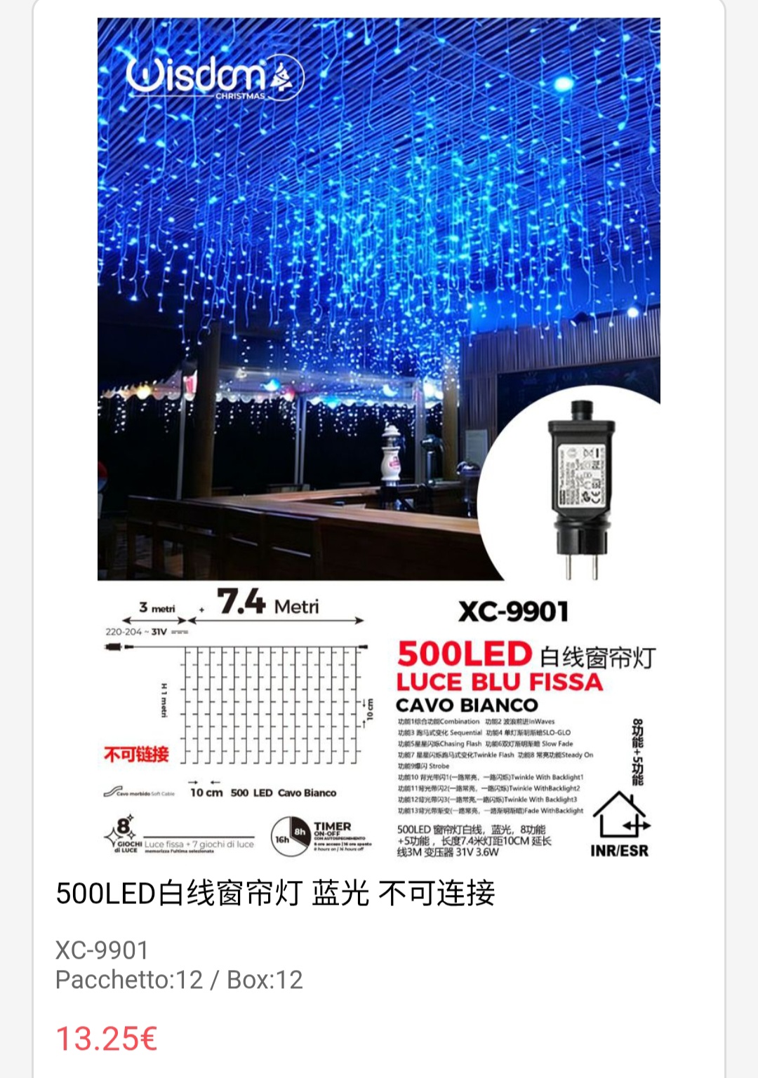 Recensisci per primo “Tenda luminosa 7,4 metri con 500LED luce blu fissa ip44 per uso interno esterno con 8 giochi luce e funzione timer on-off”